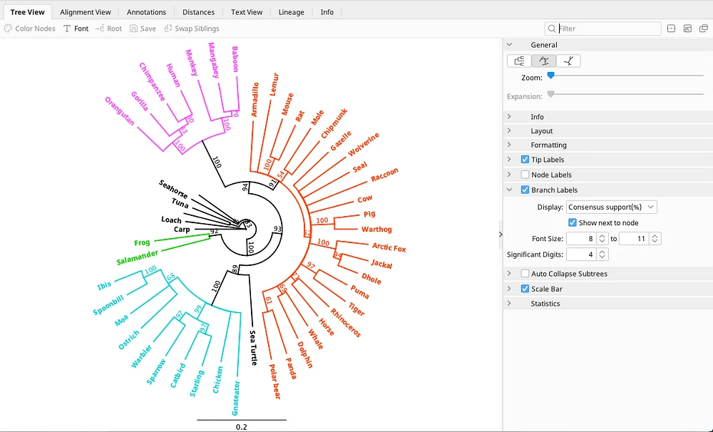 使用同行评审的算法(包括RAxML和PAUP*)构建系统发育树,并调整显示设置。